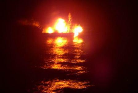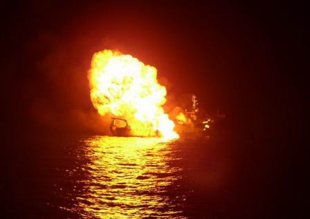 圖片顯示,“塔巴爾”號(hào)的海軍官兵動(dòng)用艦上的A-190“美洲豹”100毫米艦炮向海盜母船開(kāi)火,海軍母船中彈起火。