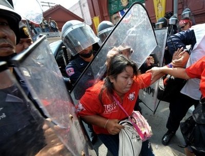 示威者投擲鐵欄泄憤,有人用磚砸爛議員的汽車,防暴警察組成人鏈,防止示威者沖擊。一名記者鼻梁被石擊中,一名防暴警察頭部也受傷,警方一度要增援。示威者其后散去。據(jù)報,他信的支持者亦在東北部多個省分示威,抗議阿披實(shí)當(dāng)選。