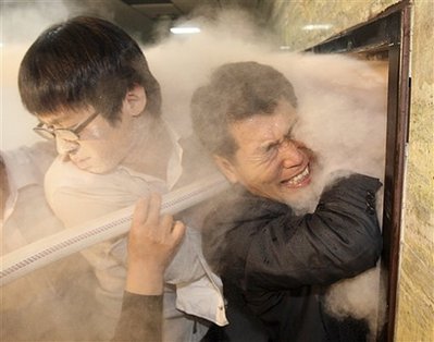 圖為韓國執(zhí)政黨議員使用滅火器阻止在野黨人士進(jìn)入會議室。