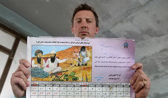 據(jù)英國《太陽報》報道,英國皇家海軍陸戰(zhàn)隊第42突擊大隊近日在一次機降突襲行動中,摧毀塔利班在阿富汗赫爾曼德省最重要據(jù),繳獲了一本2003年塔利班印制的月歷,這本月歷以拉登和塔利班最高頭目奧馬爾為封面人物。