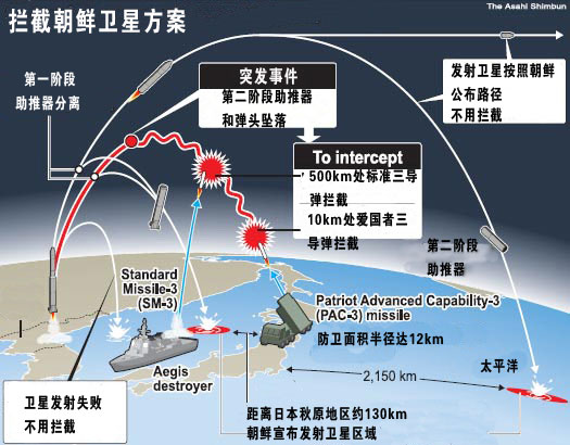 《朝日新聞》報(bào)道稱,日本已經(jīng)分別在驅(qū)逐艦上布署了海基型“標(biāo)準(zhǔn)三型(SM3)”防空導(dǎo)彈和陸基型“愛國者三型(P3C)”地對空導(dǎo)彈。在裝備有“宙斯盾”作戰(zhàn)系統(tǒng)的驅(qū)逐艦上部署了海基型“標(biāo)準(zhǔn)三型(SM3)”防空飛彈,這種飛彈采用熱導(dǎo)技術(shù)探測目標(biāo),可以在目標(biāo)的預(yù)定軌道上等待。一旦發(fā)現(xiàn)可疑目標(biāo),便將其擊落。如果;鶚(biāo)準(zhǔn)三型飛彈攔截行動(dòng)失敗,雷達(dá)將引導(dǎo)陸基愛國者三型導(dǎo)彈實(shí)施第二次攔截,擊落目標(biāo)。