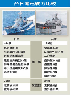 目前,釣魚島附近海域的監(jiān)控任務(wù)由海上保安廳第10、11管區(qū)兵力共同負(fù)責(zé)。第10管區(qū)共下轄各型巡視船27艘、飛機(jī)5架,其中3200噸級(jí)巡視艦2艘、1000~2000噸級(jí)巡視艦3艘;第11管區(qū)共下轄各型巡視船20艘、飛機(jī)11架,其中3200噸級(jí)巡視艦1艘、1000~2000噸級(jí)巡視艦5艘。