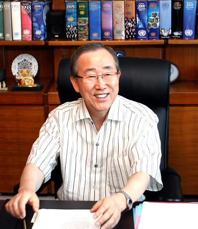 8月1日,在位于美國紐約的聯合國總部,聯合國秘書長潘基文穿短袖襯衫在辦公室工作。