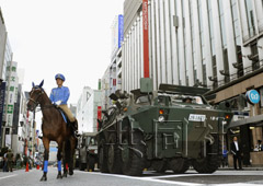在中央?yún)^(qū)的銀座地區(qū),道路被封鎖,警察和消防隊(duì)員使用繩索和云梯車從百貨店等大樓內(nèi)營救“受困者”。自衛(wèi)隊(duì)員駕駛裝甲車和救護(hù)車從地鐵站內(nèi)救出旅客并轉(zhuǎn)移到安全場所。警視廳的騎警隊(duì)也參加了演習(xí)。