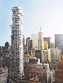 中新網(wǎng)9月15日電 為北京奧運(yùn)會(huì)“鳥(niǎo)巢”體育館進(jìn)行設(shè)計(jì)工作、受到各方贊嘆的兩位瑞士建筑設(shè)計(jì)師赫爾佐格(Jacques Herzog)和德默隆(Pierre de Meuron),將會(huì)把他們的創(chuàng)意帶到紐約。他們參與在紐約市內(nèi)興建一座透明玻璃摩天大樓。當(dāng)這座建筑物在后年建成后,驟眼看好像一層層單位半浮懸在空中,令人類(lèi)幻想中的“空中樓閣”活現(xiàn)眼前。