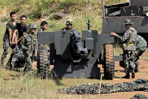 圖為10月15日,泰國軍人正在泰柬邊境架設(shè)高射炮。