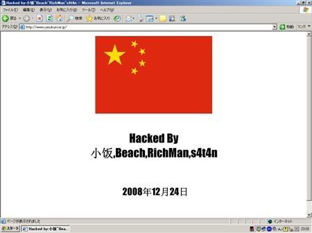 12月24日,靖國神社官方網(wǎng)站的主頁被抹去,并寫上英語“網(wǎng)頁被小飯、海灘、里奇曼、s4t4n攻擊”( Hacked By 小飯,Beach,RichMan,s4t4n),最后落款日期“2008年12月24日”。報道稱,網(wǎng)頁上還畫有中國國旗,因此可能是國外黑客的“不法襲擊”。