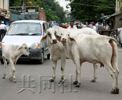 印度路上的牛很多是以前被飼養(yǎng)因產(chǎn)不出牛奶或變老而被拋棄,或是因放養(yǎng)而闖到路上的。在印度禁止食用作為神靈的“!比狻>蜎]有人想要抓那些迷路的牛。即使那些牛在道路中間成為交通的障礙,在路上逆行,市民們也都會避開。
