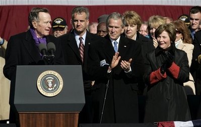據(jù)“中央社”報道,布什與親近家人及高層官員,參加核子動力航空母艦“布什號”(USS George H.W. Bush)下水服役儀式?偨y(tǒng)當選人奧巴馬1月20日進入白宮時,布什將卸下總統(tǒng)職務(wù)。