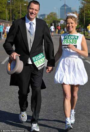 他們倆在比賽開始后七小時(shí)零五分鐘才跑到終點(diǎn)。新娘把花束擲向群眾時(shí),新郎甚至有氣力支撐著她走過終點(diǎn)。皮特說:“這是我一生中最美好的一天,但我決定不再做這種事了!