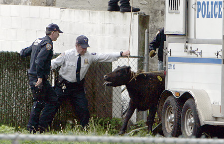 20歲的卡恩(Adam Kahn)對《紐約郵報》說,“不知道從哪里來的一只母牛,突然跑進我的院子,嚇死人了!”他說,“我看過浣熊和其它什么的,但可從來沒看過母牛呢!這真是瘋狂”。