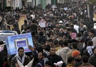 用來建造邊界圍墻的鐵板倒塌,加沙民眾帶著羊、雞以及好幾箱的可樂,越過散落一地的廢棄物,未受到任何阻礙。有些人則帶回了電視機與汽車輪胎。攤販則向群眾兜售飲料與烘烤產品。