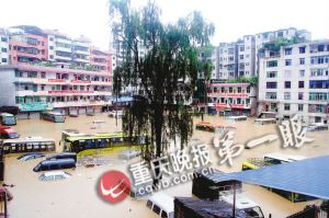 前晚9時(shí)許,酉陽縣城開始下起暴雨。昨晨,酉城河水也漫過河床,涌向縣城主街的低洼角落。至上午10時(shí)許,縣城東風(fēng)壩、城北車站、小商品一條街、桃花源中路等街道門面進(jìn)水,水深1.5米左右,酉陽報(bào)社被淹,停放在街邊、車站內(nèi)的許多車輛被水淹沒。