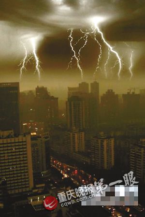 昨上午10時(shí)左右,大片的黑色云朵從北向南逼近并覆蓋主城上空,原本已放亮的天空,慢慢地變黑,短短10多分鐘,整個(gè)主城區(qū)已經(jīng)宛如黑夜,馬路上的車輛紛紛打開車燈,緩慢行駛!疤旌凇睕]多久,閃電劃破“夜空”,驚雷緊隨而至,并未經(jīng)過鋪墊,大雨如注鋪天蓋地砸向地面,突如其來的暴雨,致使主城很多地方的道路產(chǎn)生積水。