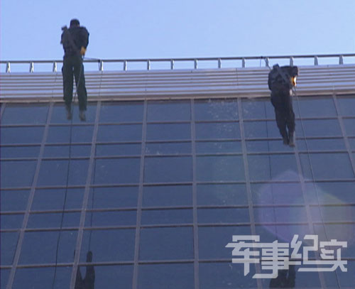 僅僅用時20多秒,惠寶林便從地面抵達(dá)了十層大樓的樓頂。選擇好位置,惠寶林便悄悄地固定好繩索,準(zhǔn)備下滑。