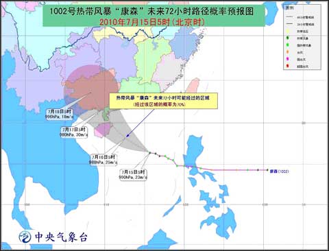 預(yù)計(jì),“康森”將以每小時(shí)20公里左右的速度繼續(xù)向西偏北方向移動(dòng),強(qiáng)度將有所加強(qiáng),并逐漸向海南陵水到廣東陽(yáng)江一帶沿?拷,將于16日下午到17日凌晨在這一帶沿海登陸。