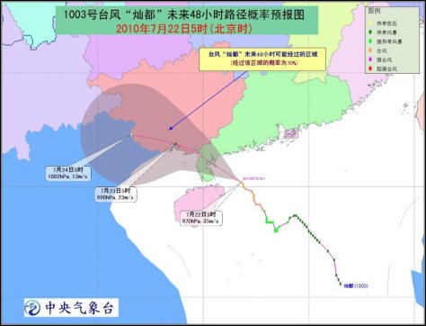 中新網(wǎng)7月22日電 據(jù)中央氣象臺(tái)消息,攜風(fēng)帶雨,“燦都”的腳步正一步步逼近,中央氣象臺(tái)今日凌晨繼續(xù)發(fā)布臺(tái)風(fēng)橙色預(yù)警,預(yù)計(jì)今日中午前后“燦都”將在廣東徐聞到電白一帶沿海登陸。華南沿!皣(yán)陣以待”、即將接受一場(chǎng)狂風(fēng)暴雨的考驗(yàn)。另外,前期降水較強(qiáng)的東北地區(qū)雨勢(shì)將有所緩和。