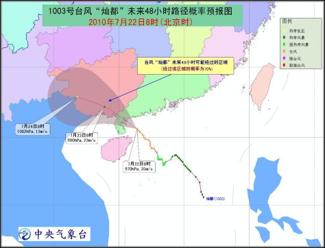 中新網(wǎng)7月22日電 中央氣象臺今日10時繼續(xù)發(fā)布臺風(fēng)橙色預(yù)警:今年第3號臺風(fēng)“燦都”的中心10時位于廣東省湛江市東南方大約70公里的近海海面上(北緯20.9度,東經(jīng)111.2度),中心附近最大風(fēng)力有12級(35米/秒),中心最低氣壓為970百帕。