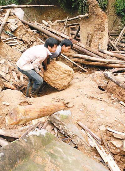15歲的邵玉乾能撿回一條命完全得益于他的貪玩。24日上午,盡管雨大,他還是帶著小外甥到房子后面的山坡上玩,不巧,小外甥陷到泥里,全身濕透,他跑回去給拿了件衣服。剛到半山腰,突然,腳下好像地動山搖,緊接著“卡啦卡啦”巨大的聲響,像爆炸一樣,山上的泥石流瞬間沖向?qū)γ娴纳狡,又折回頭沖向他這邊。他前面不遠處的一排房子全倒了。他趕緊跑過去看,奶奶被泥石淤在腰部,大聲喊著救命。這時,旁邊有人趕來,幾人用手刨了2個多小時,奶奶終于被救出。但是,邵玉乾的姐姐邵玉娟、妹妹邵玉苗,卻被埋在泥石之下。