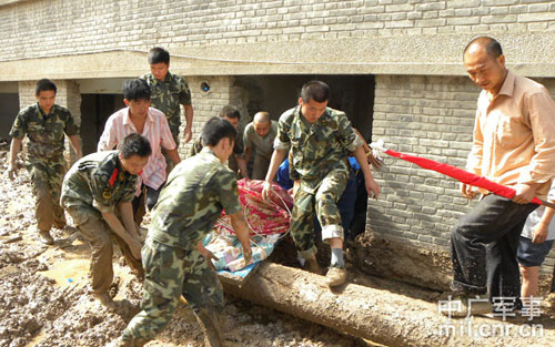 從早上到晚上,官兵們餓了就吃一口火腿腸,渴了就喝一口礦泉水,渾濁的江水打濕了官兵的衣衫。官兵們?cè)谟倌嗬镄凶呤掷щy,每走一步都要付出很大代價(jià),迷彩服上甩滿(mǎn)了泥水。街面上是近一米深的湍流的江水,阻擋了進(jìn)城和出城的腳步。一邊是回鄉(xiāng)心切的群眾和焦急等待進(jìn)入現(xiàn)場(chǎng)的救援官兵,一邊是遇難者遺體等待運(yùn)出城外。大型挖掘機(jī)的車(chē)斗成了擺渡車(chē),四級(jí)警士長(zhǎng)賈政學(xué)駕駛著挖掘機(jī),在近400米的街面上來(lái)回穿梭,把一拔一拔群眾擺渡出安全地帶,根本就沒(méi)有時(shí)間休息和吃飯。