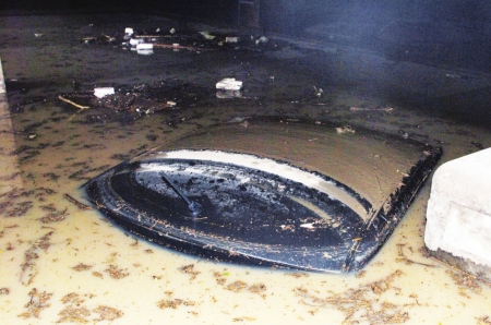 昨日凌晨1點(diǎn)過,還在睡夢中的張先生被窗外的雷鳴聲驚醒,接著他聽到樓下傳來喊叫,“車庫被淹了,快把外面的車開走!睆埾壬偷貜拇采吓榔饋,火急火燎地跑向車庫時(shí),發(fā)現(xiàn)雨下不夠半小時(shí),車庫的積水已經(jīng)漲到3米深,里面的7輛汽車全部被淹沒頂。直到昨日下午7時(shí),車庫內(nèi)的淤泥還未被清理干凈。 (記者 薛小龍 攝影 呂甲 實(shí)習(xí)生 周烜)