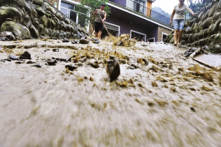 13日凌晨零點(diǎn)20分左右,都江堰上空突降暴雨,局部地區(qū)達(dá)到142毫米。強(qiáng)降雨造成都江堰城區(qū)和部分山區(qū)出現(xiàn)險(xiǎn)情,城區(qū)內(nèi)多處民房和街道被淹。部分板房安置區(qū)因提前備好抽水設(shè)備,積水短時(shí)間內(nèi)即被排出。都江堰水務(wù)局防汛辦主任張普龍說,這是近10年來,都江堰短時(shí)最大強(qiáng)降雨。