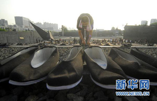 為了紀(jì)念二戰(zhàn)期間在日本遇害的6830名被強(qiáng)擄的中國(guó)勞工,14日下午,被擄勞工中的幸存者及遇難者家屬、日本友人等近50人在南京舉行了6830雙布鞋擺放活動(dòng)。