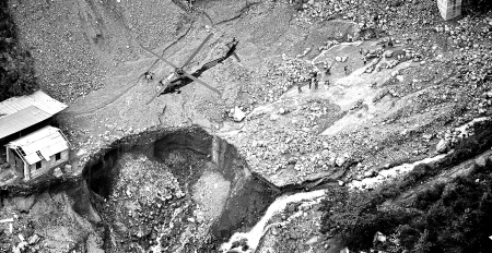從機(jī)艙往下看,翠綠的山體上一道道灰白色的泥石流觸目驚心,曾經(jīng)的美麗小鎮(zhèn)被泥石流拉開(kāi)一道巨大的傷口。