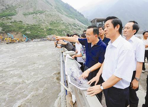 時刻關(guān)注汶川縣映秀鎮(zhèn)特大山洪泥石流災(zāi)害搶險救災(zāi)工作的省委書記、省人大常委會主任劉奇葆,16日下午再次趕往映秀鎮(zhèn),指導(dǎo)搶險救災(zāi)工作,強調(diào)要不惜一切代價,加快處理岷江河道中的壅塞體,拓寬河面,加大流量,降低水位,盡快讓岷江回歸正常河道,確保映秀鎮(zhèn)安全,確保人民群眾生命安全。