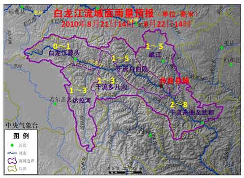 預(yù)計,21日14時至22日14時,白龍江流域面雨量有1~5毫米,其中干流舟曲至武都流域面雨量有2~8毫米,白龍江流域發(fā)生地質(zhì)災(zāi)害的可能性較大。