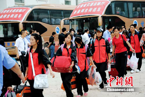 記者在現(xiàn)場(chǎng)看到,26輛豪華大巴分兩排停放在車(chē)場(chǎng),1000多名學(xué)生身穿紅、藍(lán)兩種不同顏色校服,提著行李在老師和志愿者的幫助下排隊(duì)上車(chē),從他們的表情中不難看出有幾分興奮與幾分憂(yōu)傷,因?yàn)樵谒麄儺?dāng)中,很多孩子還沒(méi)有離開(kāi)過(guò)父母、離開(kāi)過(guò)舟曲。一些家長(zhǎng)淚流滿(mǎn)面依依不舍的送別孩子,并叮囑他們好好學(xué)習(xí)。