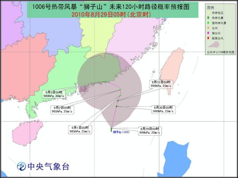 中新網(wǎng)8月29日電 據(jù)中央氣象臺(tái)網(wǎng)站消息,中央氣象臺(tái)于8月29日10時(shí)繼續(xù)發(fā)布臺(tái)風(fēng)藍(lán)色預(yù)警,2010年第6號(hào)熱帶風(fēng)暴“獅子山”的中心將以每小時(shí)5至10公里的速度向偏北方向移動(dòng),強(qiáng)度逐漸加強(qiáng),并向廣東東部到福建南部沿海靠近。29日中午到30日中午,南海北部、廣東東部沿海、福建南部沿海將有6至7級(jí)大風(fēng)。