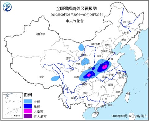 9月5日20時(shí)到6日20時(shí),四川東北部、重慶北部和西部、陜西南部、湖北西北部、山西南部、河南大部、山東西南部以及寧夏南部、甘肅東北部、內(nèi)蒙古西部、西藏東部的部分地區(qū)等地有大雨或暴雨,其中,河南中部、四川盆地東北部、重慶西北部等地局部有大暴雨;上述部分地區(qū)并伴有短時(shí)雷雨大風(fēng)等強(qiáng)對(duì)流天氣。