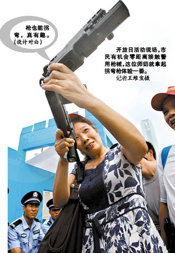 活動吸引了許多男女老少慕名前來觀看,男孩子對各種各樣的新式武器特別感興趣,都想親自摸一摸試一試,女孩子則對扮相很酷的男特警、女特警很癡迷,紛紛掏出相機(jī)和手機(jī)拍照。