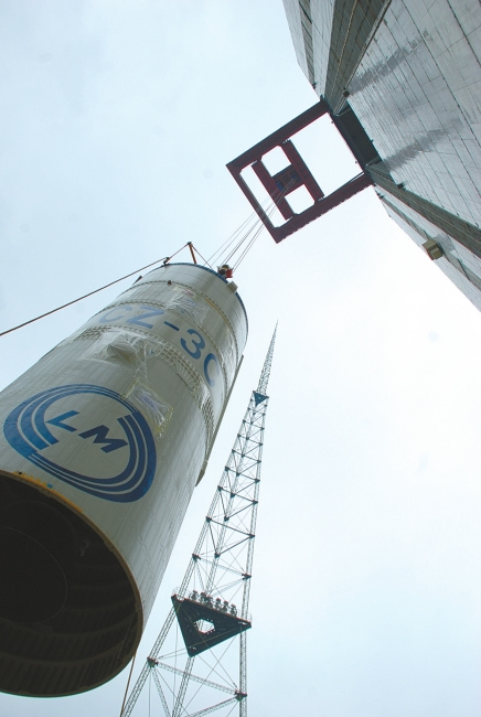 14:21,天空漸晴。二級火箭終于在一波三折下與一級火箭成功會師。16:55,三級火箭也成功完成吊裝。(占康 秦鵬 李寰)