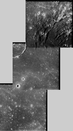 最上面的幀圖拍攝于2006年1月1日,當(dāng)時(shí)距離月球表面約1087千米,分辨率為98 m/pixel,中心位于西經(jīng)40.2度,南緯25.9度;另外兩張都拍攝于2006年1月13日,拍攝距離、分辨率和中心分別為1069千米,97 m/pixel,西經(jīng)40.2度,南緯27.3度(中圖)和1050千米,95 m/pixel,西經(jīng)40.2度,南緯28.8度(下圖)。