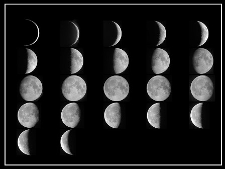 月球位于日、地之間時叫做“朔”,月球暗的半個球朝向地球,我們看不到它。朔之后的一兩天,鐮刀狀的新月在傍晚西方的天空中露面,凸面向著落日的方向。以后月球相對于太陽逐漸向東移動,亮的部分日益擴展。五六天以后成了半圓形,這時的月相稱為“上弦”,日落時月球在天子午線附近。再經過7天,便到了“望”(滿月),月球與太陽遙遙相望,我們看到的是一輪明月于傍晚東升,在晨曦中西落,將黑夜照耀得如同白晝一般。滿月以后,圓輪的西部日益虧缺。到“下弦”時,呈半圓形,月球到半夜才升起。和上弦月相反,下弦月是東邊半個圓被照亮。下弦以后,半圓繼續(xù)虧缺,成為黎明前掛在東方天空的一絲殘月。它愈來愈接近太陽,終于跑到和太陽相同的方向,朔又來臨了。