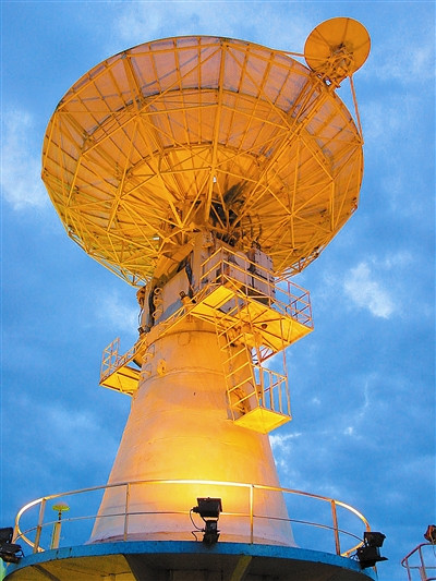 甲板上,2個(gè)巨大的乳白色雷達(dá)鍋,警覺(jué)地注視著衛(wèi)星即將飛來(lái)的方位。船艙內(nèi),一排排彩色顯示屏幕上,不斷變化著各種信息畫(huà)面和數(shù)據(jù)。船員們各自堅(jiān)守著崗位。