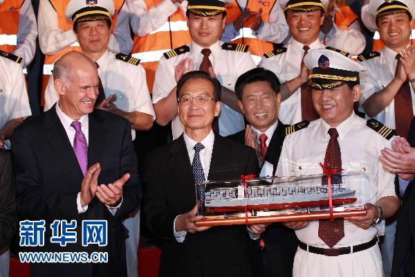 隨后,中希兩國總理又來到?吭诖a頭邊上的“中遠太倉”號集裝箱貨輪旁。這艘可裝載10000個標(biāo)準(zhǔn)箱的集裝箱貨輪,由中遠集團旗下的南通中遠川崎公司自主設(shè)計建造。溫家寶和帕潘德里歐走到船邊,看望了船員和碼頭工人,并與他們在輪船旁合影。船長向兩國總理贈送了“中遠太倉”輪的船模。