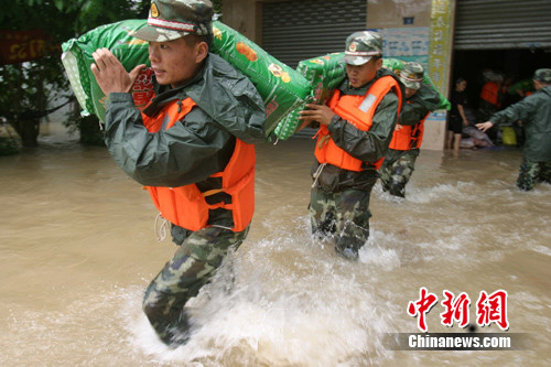 6日8時(shí)10分,瓊海市嘉積鎮(zhèn)橋頭村、塔洋鎮(zhèn)、中原鎮(zhèn)等地區(qū)被洪水淹沒,4500名村民生命危在旦夕。武警一支隊(duì)接到命令后,立即組織200多名官兵,在總隊(duì)副參謀長宮鐵芳,一支隊(duì)政委肖方明,參謀長卓世武的率領(lǐng)下,分乘6輛大卡車,攜帶編織袋、救生艇23臺(tái)(艇)、救生衣、鐵鍬、鋤頭火速奔赴抗洪一線,疏散、轉(zhuǎn)移、搶救受災(zāi)群眾,打撈被淹貴重物資。