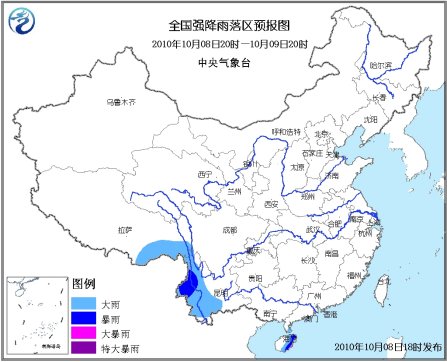 10月8日20時(shí)到9日20時(shí),海南中東部、雷州半島東南部、云南西部、西藏東南部等地有大雨或暴雨,其中海南東南部的局部地區(qū)有大暴雨;上述地區(qū)局部伴有短時(shí)雷雨大風(fēng)等強(qiáng)對(duì)流天氣。