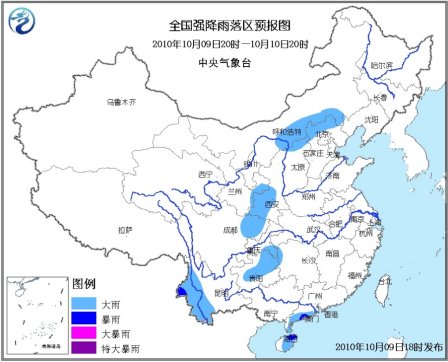 10月9日20時(shí)到10日20時(shí),廣東西南部、海南中東部、云南西部、四川東北部、重慶東南部、貴州東北部、甘肅東部、陜西西南部、山西北部、河北西北部、內(nèi)蒙古中部偏南地區(qū)等地有大雨,其中,云南西部、海南東部、廣東西南部等地的部分地區(qū)有暴雨。上述地區(qū)局部伴有短時(shí)雷雨大風(fēng)等強(qiáng)對(duì)流天氣。