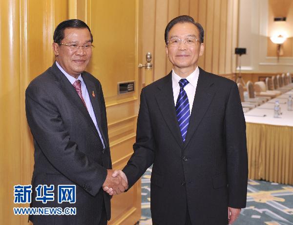 溫家寶說,中柬兩國關(guān)系正進一步發(fā)展。2006年我訪問貴國時,兩國決定建立全面合作伙伴關(guān)系。這把兩國關(guān)系推進到一個新階段。中柬友誼經(jīng)歷了時間的考驗,在關(guān)鍵時期和在重大問題上,我們得到了貴國的寶貴支持。在這方面,首相表現(xiàn)出了政治家的堅定意志。我很愿意就中柬雙邊關(guān)系和雙方共同關(guān)心的問題和首相交換意見。
