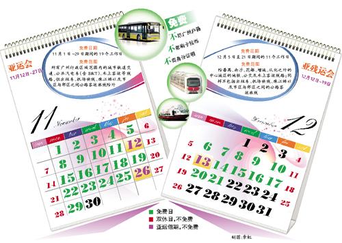 在亞運會及亞殘運會機動車單雙號限行的46天期間(11月1日至29日、12月5日至21日),剔除13個雙休日和3天亞運假期后的30個工作日里,廣州公共交通服務免費。