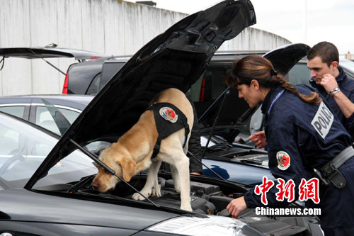 胡主席來訪,法國進(jìn)行嚴(yán)密安保。圖為一女警攜警犬在檢查車輛。