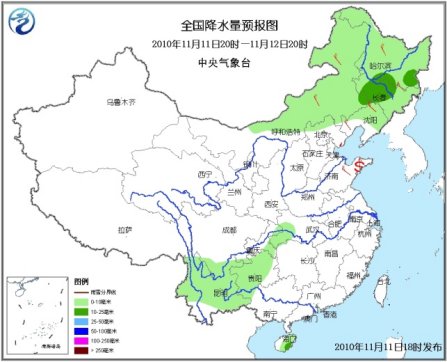 11日20時至12日20時,內蒙古中東部、東北大部、河北西北部等地有小到中(雨)雪或雨夾雪,其中,內蒙古東部偏南地區(qū)、遼寧北部、吉林大部、黑龍江東南部等地有大雪,內蒙古東部偏南地區(qū)、吉林中部、黑龍江東南部等地的部分地區(qū)有暴雪;川西高原南部、重慶東部、湖北西南部、云南大部、貴州大部、廣西西部、海南大部等地有小到中雨。內蒙古西部和東部、華北、東北地區(qū)、黃淮等地有4~6級風。山東半島附近有揚沙或浮塵天氣。渤海、黃海北部和中部將有7~8級、陣風9級的西北風;臺灣海峽、臺灣以東洋面和以南海域、南海東北部海域將有6~8級的東北風。