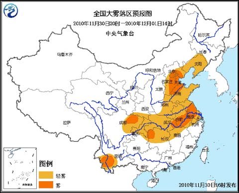 中央氣象臺11月30日18時發(fā)布大霧藍色預警: