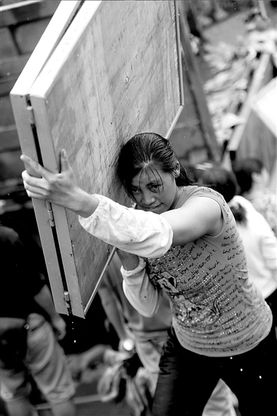 羅炳輝將軍廣場是彝良最大的災民安置點之一,2000名受災群眾集中安置在百余個帳篷內。50多歲的毛振強和老伴帶著兩個孫子一起住在帳篷里。前天夜間,他和安置點的其他人一樣,被大風和暴雨擾得睡不著覺。昨天凌晨1點左右,廣場上開始積水,很快水就漫過薄薄的紙板,被褥衣物都洇濕了!拔覀冓s緊把東西收拾起來,就這么站了一夜沒能睡覺!庇捎趲づ駜任锲愤M水,昨天白天,安置點內的很多災民連坐的地方都沒有,蹲在地上吃飯,也沒法睡覺。