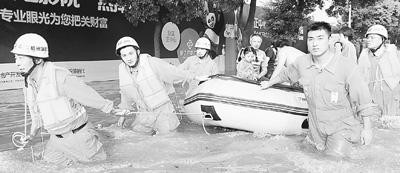10月10日,來(lái)余姚支援的杭州消防支隊(duì)武警官兵在余姚市南西路幫助轉(zhuǎn)移被困群眾。