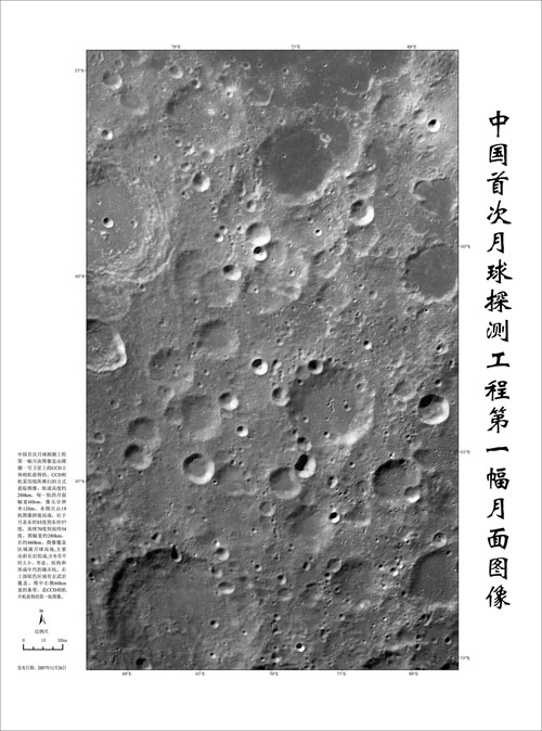 消息說(shuō),中國(guó)首次月球探測(cè)工程第一幅月面圖像是由嫦娥一號(hào)衛(wèi)星上的CCD立體相機(jī)獲得的。CCD相機(jī)采用線陣推掃的方式獲取圖像,軌道高度約200km,每一軌的月面幅寬60km,像元分辨率120m。中國(guó)第一幅月面圖像共由19軌圖像制作而成,位于月表東經(jīng)83度到東經(jīng)57度,南緯70度到南緯54度,圖幅寬約280km,長(zhǎng)約460km。圖中右側(cè)60公里寬的條帶,是CCD相機(jī)開(kāi)機(jī)獲得的第一軌圖像。